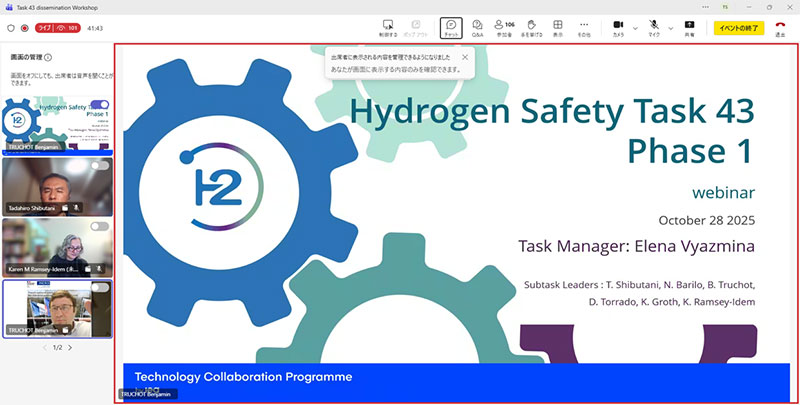 2025年10月28日に開催された国際会議 「Task 43 Safety and RCS of Large Scale Hydrogen Energy Applications」において、このプロジェクトのサブタスクAのリーダーでもある澁谷先生(教授・当ユニット長)が、これまでの活動について説明しました。